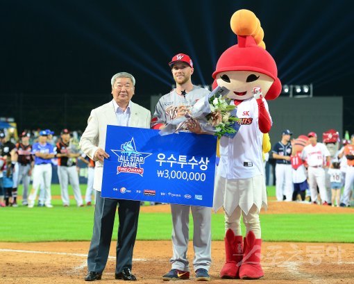 15일 대구 삼성라이온즈파크에서 열린 ‘2017 타이어뱅크 KBO리그 올스타전’에서 드림팀이 13-8로 승리했다. 경기 후 열린 시상식에서 드림팀 SK 켈리가 우수투수상을 수상하고 있다. 대구 | 김진환 기자 kwangshin00@donga.com