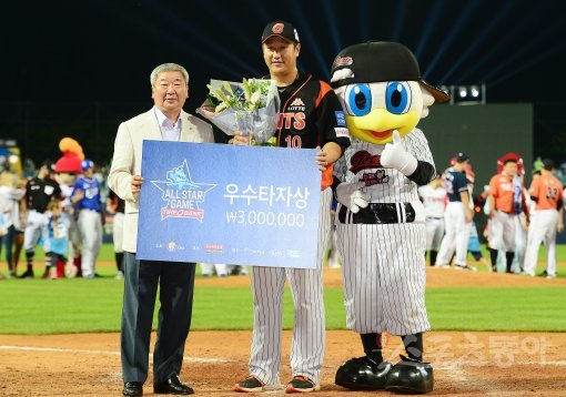 15일 대구 삼성라이온즈파크에서 열린 ‘2017 타이어뱅크 KBO리그 올스타전’에서 드림팀이 13-8로 승리했다. 경기 후 열린 시상식에서 우수타자상을 수상한 드림팀 롯데 이대호가 구본능 KBO 총재(왼쪽)와 기념촬영을 하고 있다. 대구 | 김진환 기자 kwangshin00@donga.com