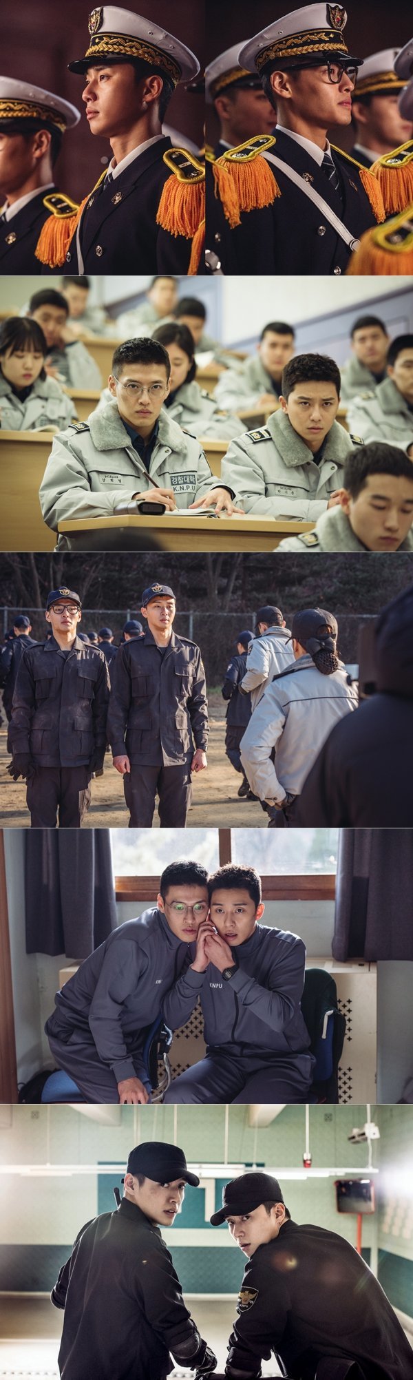 먼저 입학식, 졸업식 등 경찰대학의 중요한 행사 시에만 갖춰 입는 ‘예복’을 착용한 두 청년의 모습이 시선을 사로잡는다. 어깨의 화려한 견장이 돋보이는 가운데, 신입생의 풋풋한 매력과 늠름한 모습을 동시에 엿볼 수 있어 경찰대생의 명예와 긍지가 느껴진다. ‘정복’은 각종 교내 행사를 포함한 공식적인 자리에서 입는 복장. 한 손에 두른 깁스와 얼굴 가득한 상처가 무색하게, 말쑥한 ‘정복’을 차려 입은 두 청년은 더 이상 사회초년생이 아닌 한층 더 성장한 모습을 예고하며 환한 웃음을 짓고 있다. ‘근무복’을 입고 수업을 듣고 있는 ‘기준’과 ‘희열’의 스틸은 코믹한 표정이 눈에 띈다. 쌍꺼풀이 생길 정도로 수업에 집중하는 둘의 모습은 웃음을 유발하는 동시에, 이들이 선보일 콤비 플레이를 예고하며 기대감을 더욱 높인다.