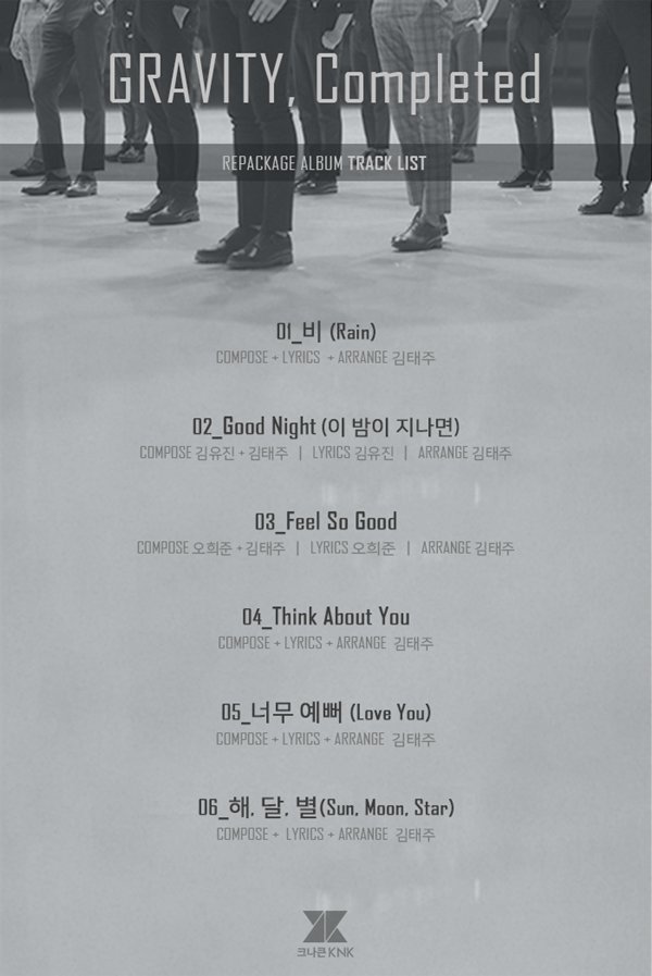 오늘(17일) 크나큰은 공식 SNS를 통해 \'그래비티, 컴플리티드(GRAVITY, Completed)\' 앨범의 트랙리스트를 공개했다. 특히 이번 앨범 수록곡엔 멤버 희준과 유진이 작사, 작곡에 참여해 눈길을 끈다.