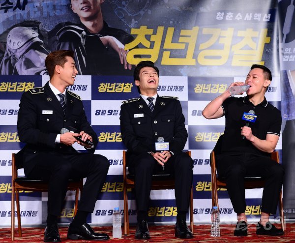 17일 서울 광진구 롯데시네마 건대입구에서 영화 ‘청년경찰’ 제작보고회가 열렸다. 배우 박서준과 강하늘이 김주환 감독을 바라보며 환하게 웃고 있다.