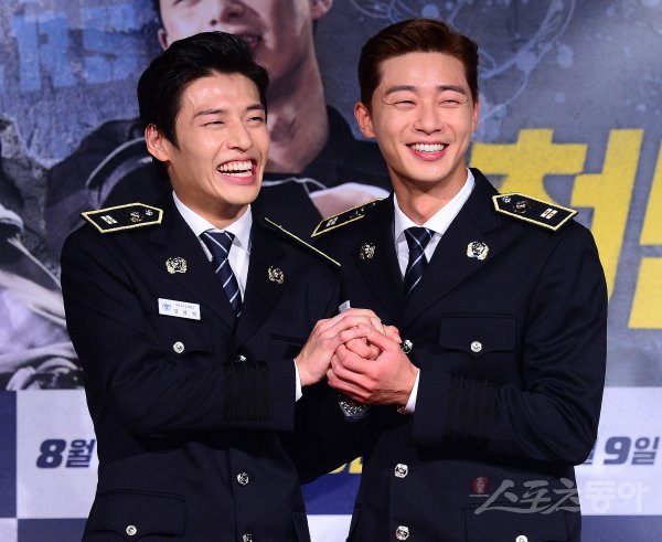 17일 서울 광진구 롯데시네마 건대입구에서 영화 ‘청년경찰’ 제작보고회가 열렸다. 배우 강하늘과 박서준(오른쪽)이 포토타임을 가지고 있다.