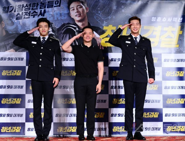 17일 서울 광진구 롯데시네마 건대입구에서 영화 ‘청년경찰’ 제작보고회가 열렸다. 배우 강하늘과 김주환 감독, 배우 박서준(왼쪽부터)이 포토타임을 가지고 있다.