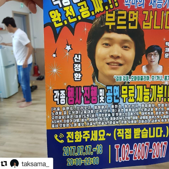 공개된 사진 속에는 신정환과 탁재훈의 \'행사 진행 및 공연 무료 재능기부\' 홍보 전단지가 담겼다. 이는 7년 만에 복귀하는 신정환의 새 프로그램 Mnet \'초심 소환 프로젝트\'의 일환이다. 이상민의 글 속 "무조건퍼가라는 재훈형"을 미루어 보아 탁재훈의 요청으로 인해 신정환 지원 사격에 나선 것으로 보인다.