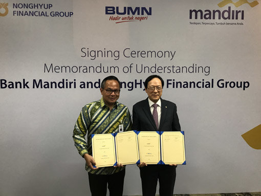 NH농협금융이 인도네시아 만디리 은행과 손잡고 현지시장 공략을 본격화한다. 양측은 17일 인도네시아 자카르타 만디리 은행 본사에서 사업협력 강화를 위한 업무협약을 체결했다. 만디리 은행은 자산규모 94조원 계열사 11개·임직원 3만9000명·점포 3626개를 소유한 인도네시아 최대 은행이다.