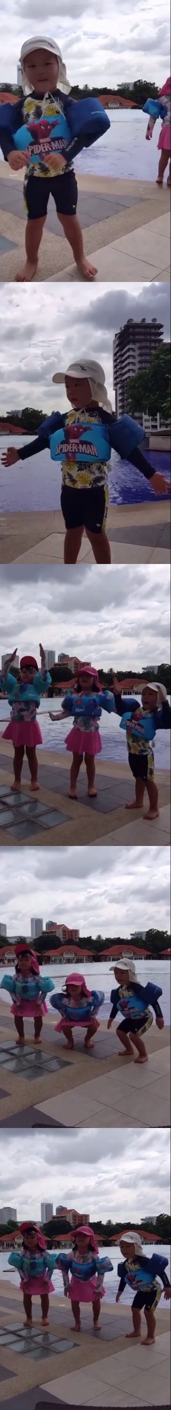 올라온 영상에는 수영복을 입고 팔에 튜브를 낀 대박이가 수영장에 들어가기 전 준비 운동을 하고 있다. 어느새 대박이의 누나인 설아와 수아도 합류하여 ‘설수대’ 3인방의 귀여운 준비체조가 이어졌다.
