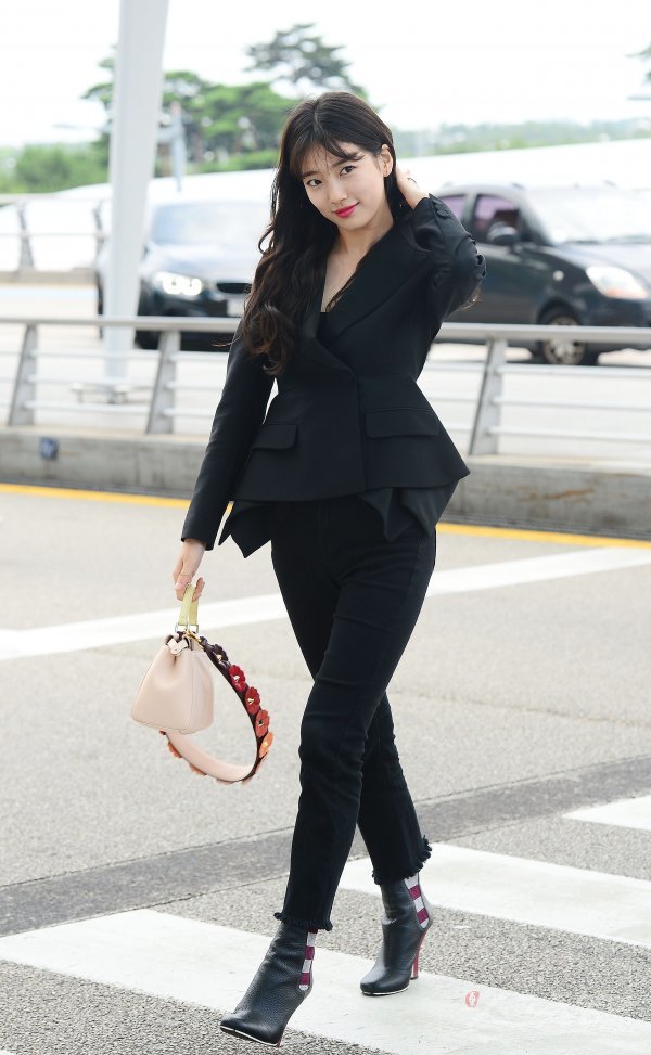 18일 가수 겸 배우 수지가 이탈리아 로마로 화보촬영을 위해 인천국제공항을 통해 출국하고 있다. 수지가 건널목을 건너며 포즈를 취하고 있다.