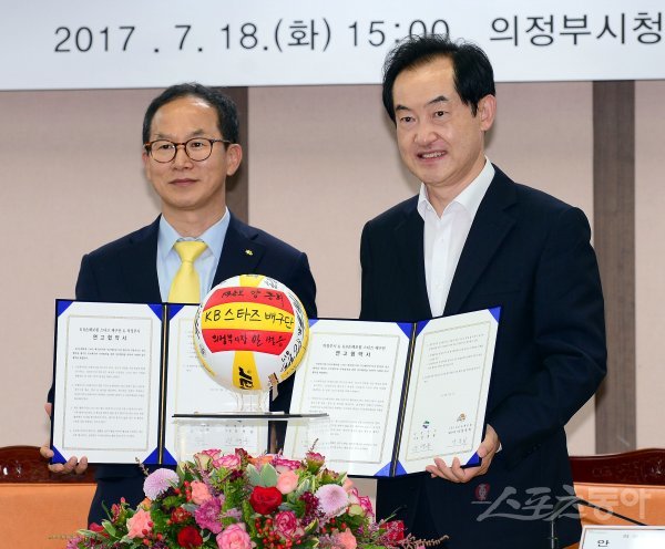 남자 프로배구단 KB손해보험과 경기도 의정부시의 연고 협약 체결식이 18일 의정부시청 상황실에서 열렸다. 양종희 구단주(왼쪽)와 안병용 의정부시장이 협약서에 서명을 한 후 기념촬영을 하고 있다.