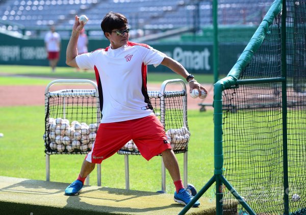 18일 인천 SK행복드림구장에서 ‘2017 타이어뱅크 KBO리그’ SK 와이번스와 두산 베어스의 경기가 열린다. 경기전 SK 김성갑 코치가 배팅볼을 던지고 있다.