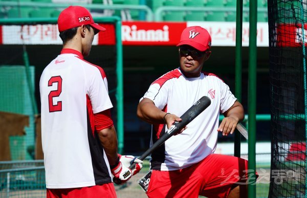 18일 인천 SK행복드림구장에서 ‘2017 타이어뱅크 KBO리그’ SK 와이번스와 두산 베어스의 경기가 열린다. 경기전 SK 정경배 코치가 박승욱의 타격에 대해 이야기하고 있다.