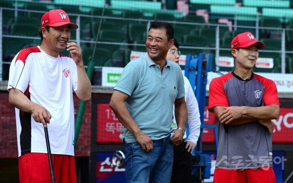 18일 인천 SK행복드림구장에서 ‘2017 타이어뱅크 KBO리그’ SK 와이번스와 두산 베어스의 경기가 열린다. 경기전 김경기 해설위원이 SK 박계원, 정수성 코치와 이야기를 나누고 있다.