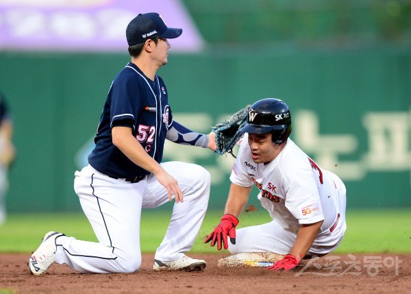 18일 인천 SK행복드림구장에서 ‘2017 타이어뱅크 KBO리그’ SK 와이번스와 두산 베어스의 경기가 열렸다. 5회말 무사 1루에서 SK 박정권 타석 때 1루 주자 정의윤이 폭투로 2루까지 진루하고 있다.