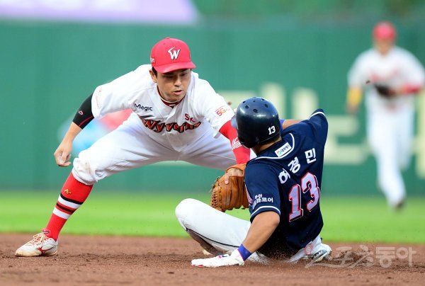18일 인천 SK행복드림구장에서 ‘2017 타이어뱅크 KBO리그’ SK 와이번스와 두산 베어스의 경기가 열렸다. 5회초 1사 1루에서 두산 박세혁의 내야 땅볼 때 1루 주자 허경민이 2루에서 SK 나주환에게 태그 아웃되고 있다.