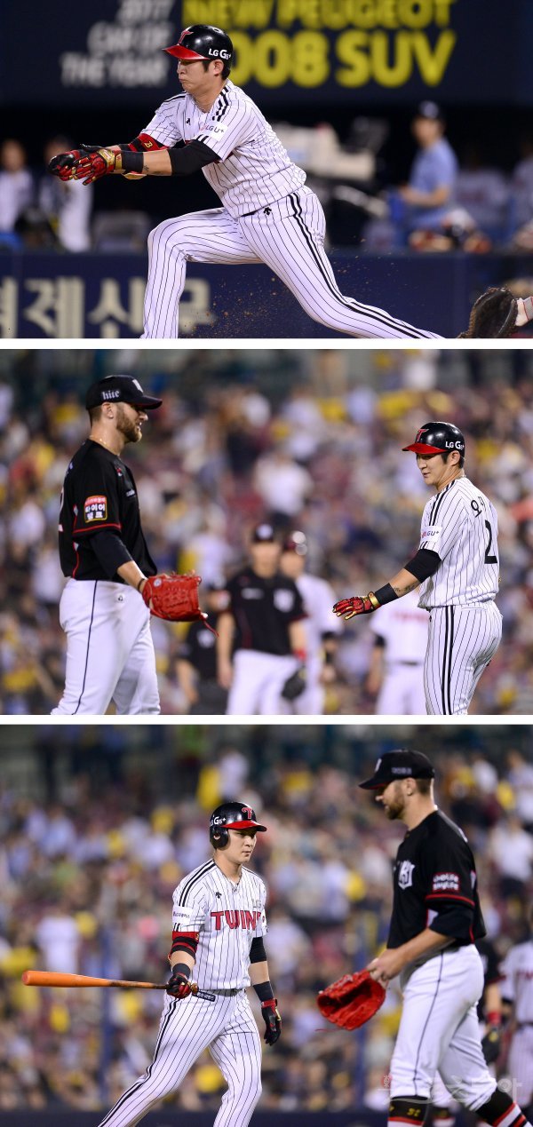 18일 잠실야구장에서 ‘2017 타이어뱅크 KBO 리그’ kt위즈와 LG트윈스의 경기가 열렸다. 7회말 1사 1루 LG 오지환이 헛스윙을 하며 배트를 놓쳐 투수쪽으로 날아가자 배트를 받으러 가며 kt 피어밴드에게사과를 하고 있다.