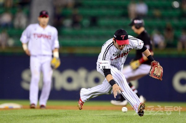 18일 잠실야구장에서 ‘2017 타이어뱅크 KBO 리그’ kt위즈와 LG트윈스의 경기가 열렸다. 8회초 무사 1루 LG 오지환이 kt 박기택의 땅볼 타구를 실책하고 있다. 잠실 | 김종원 기자 won@donga.com