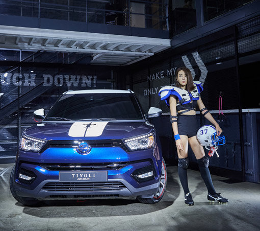 쌍용자동차는 17일 서울 강남 쿤스트할레에서 상품성을 개선한 티볼리 아머를 새롭게 선보였다. 미식축구 보호구와 메카닉 이미지에서 영감을 얻은 새 범퍼 디자인으로 스포티하고 미래지향적인 느낌을 더했다.사진제공|쌍용자동차