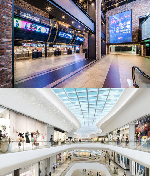 18일 오픈한 ‘CGV용산아이파크몰’ 내부(위)와 8월 24일 오픈 예정인 ‘스타필드 고양’ 내부 조감도. 복합쇼핑몰이 영화·레저·힐링 등 다채로운 테마로 무장하며 변신 중이다. 고객들의 매장 방문을 유도하는 ‘풀 마케팅’ 일환으로, 가까운 유통 매장에서 다양한 경험을 할 수 있다는 매력을 강조하고 있다. 사진제공 l 현대아이파크몰·신세계
