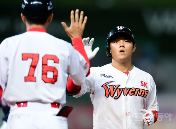 18일 인천 SK행복드림구장에서 ‘2017 타이어뱅크 KBO리그’ SK 와이번스와 두산 베어스의 경기가 열렸다. 7회말 2사 3루에서 SK 조용호가 역전 적시타를 치고 난 뒤 김인호 코치의 환영을 받고 있다.
