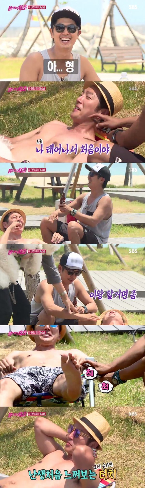 이후 김부용은 류태준의 몸에 태닝 오일을 발라주기 시작했고, 웃음을 멈추지 못했다. 그러자 류태준은 “너무 소심하다. 이왕 할거면”이라고 말해 눈길을 끌었다.
