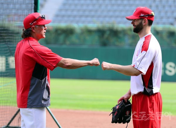 19일 인천 SK행복드림구장에서 ‘2017 타이어뱅크 KBO리그’ SK 와이번스와 두산 베어스의 경기가 열린다. 경기전 SK 힐만 감독이 다이아몬드와 하이파이브를 나누고 있다.