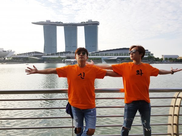 공개된 사진 속 민우와 앤디는 싱가폴의 대표적인 상징 머라이언을 이용해 재미있는 포즈를 취하고 있어 눈길을 끈다. 특히 두 사람은 신화의 대표 색 주황색을 이용해 ‘신’과 ‘화’라는 글자가 적힌 티셔츠를 입고 있어 폭소를 자아낸다.