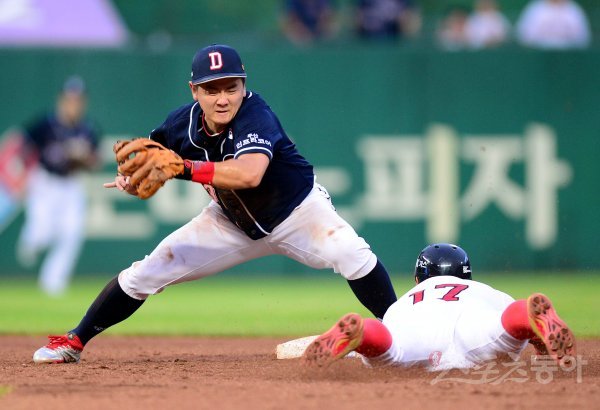 19일 인천 SK행복드림구장에서 ‘2017 타이어뱅크 KBO리그’ SK 와이번스와 두산 베어스의 경기가 열렸다. 3회말 무사 1루에서 SK 최정 타석 때 1루 주자 노수광이 2루 도루에 성공하고 있다. 두산이 비디오 판독을 요청했으나 세이프.
