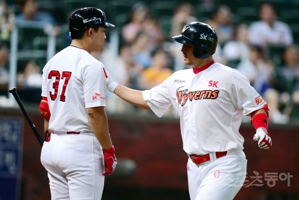 19일 인천 SK행복드림구장에서 ‘2017 타이어뱅크 KBO리그’ SK 와이번스와 두산 베어스의 경기가 열렸다. 5회말 2사에서 SK 최정이 두산 이현호를 상대로 시즌 32호 좌월 솔로 홈런을 쏘아올린 뒤 정의윤과 기쁨을 나누고 있다.
