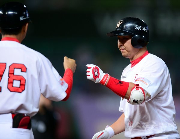 19일 인천 SK행복드림구장에서 ‘2017 타이어뱅크 KBO리그’ SK 와이번스와 두산 베어스의 경기가 열렸다. 6회말 2사 1, 2루에서 SK 최정이 1타점 적시타를 날린 뒤 김인호 코치의 환영을 받고 있다. 최정은 이날 4안타를 기록했다.