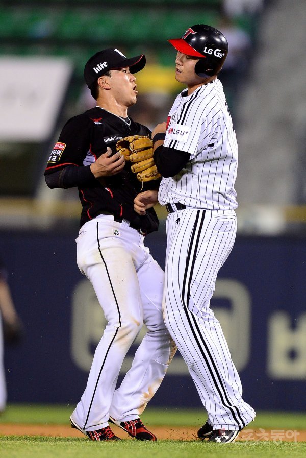 19일 잠실야구장에서 ‘2017 타이어뱅크 KBO 리그’ kt위즈와 LG트윈스의 경기가 열렸다. 8회말 무사 1루 LG 강승호 내야 땅볼 때 kt 정현이 1루주자 김재율을 태그 아웃시키고 있다 .