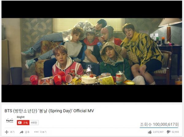그룹 방탄소년단의 ‘봄날’ 뮤직비디오가 1억 뷰를 돌파했다.