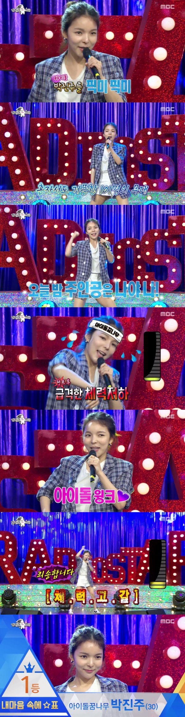 ‘나야 나’는 101명이 무대에 서는 노래이지만 박진주는 혼자임에도 완벽한 안무와 노래를 선보여 작은 체구임에도 무대를 가득 채워 출연진들과 시청자들의 눈길을 사로잡았다. 하지만 곧 급격한 체력 저하로 “죄송합니다 전 앞으로 열심히 연기 할게요”라고 말해 큰 웃음을 자아냈다.