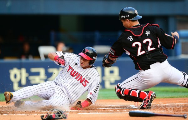 20일 서울 잠실야구장에서 ‘2017 타이어뱅크 KBO리그’ LG트윈스와 kt위즈의 경기가 열렸다. 1회말 1사 2루에서 LG 강승호가 박용택의 적시타 때 홈으로 쇄도해 득점하고 있다.