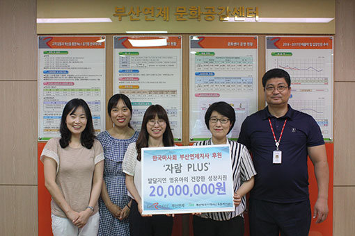 한국마사회 부산연제문화공감센터는 지난 14일 부산지역 발달지연 아동의 건강한 성장지원 사업인 ‘자람Plus’를 돕기 위해 부산광역시 장애인종합복지관에 기부금 2000만원을 전달(사진)했다. 이 기부금은 장애 위험군 발달지연 유아의 선별평가·상담, 어린이집교사·부모교육, 발달촉진 놀이감 배부, 저소득계층 장애 진단비지원·개별상담 등을 위해 전액 사용될 예정이다.