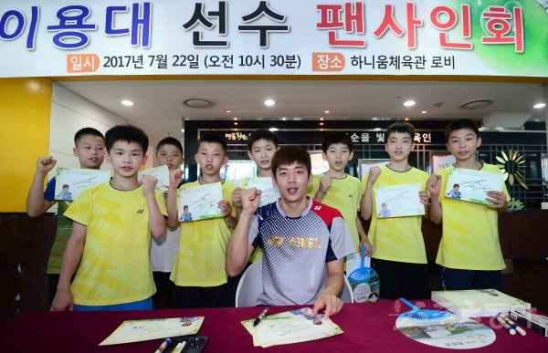 ‘이용대 올림픽제패기념 2017 화순 전국학교대항 배드민턴선수권대회’가 22일부터 28일까지 전남 화순군 하니움문화스포츠센터와 이용대체육관에서 열린다. 22일 대회 첫 날 오전 이용대(요넥스)가 하이움체육관에서 팬사인회를 하고 있다. 화순 | 김종원기자 won@donga.com
