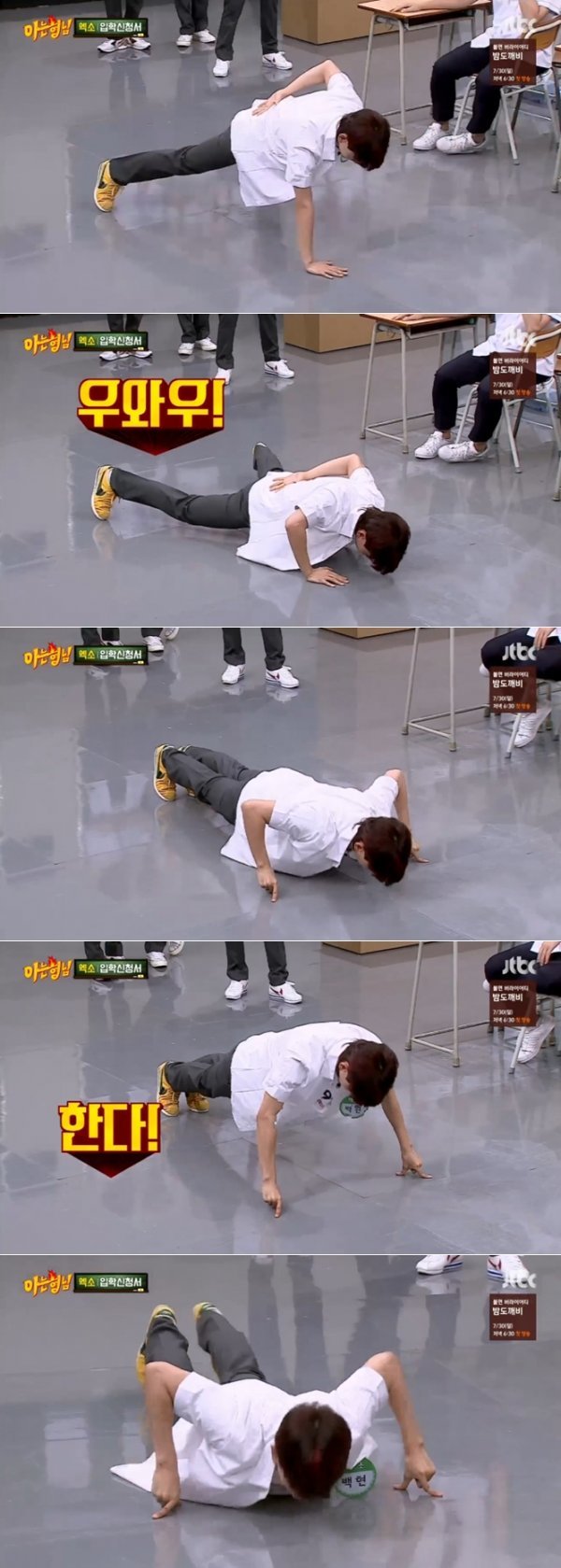 백현은 22일 방송된 jtbc ‘아는형님’에서 한 손으로 팔굽혀펴기에 도전했다. “한 번도 해본 적 없지만 해보겠다”고 호기롭게 도전한 백현. 그는 손쉽게 성공해 감탄을 자아냈다. 여기서 멈추지 않고 두 손가락으로 팔굽혀펴기까지 성공, 박수를 이끌어냈다.