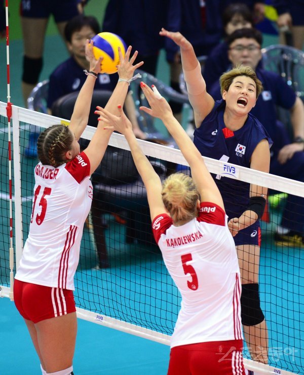 23일 수원 실내체육관에서 ‘2017 국제배구연맹(FIVB) 그랑프리 여자 배구 대회’ 2그룹 예선 라운드에서 한국 김희진이 폴란드 블로커를 피해 스파이크를 날리고 있다.