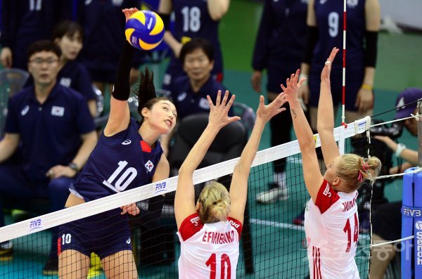 23일 수원 실내체육관에서 ‘2017 국제배구연맹(FIVB) 그랑프리 여자 배구 대회’ 2그룹 예선 라운드에서 한국 김연경이 폴란드 블로커를 피해 스파이크를 날리고 있다.