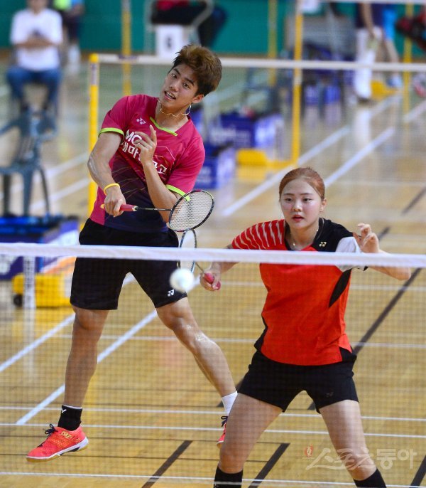 ‘이용대 올림픽제패기념 2017 화순 전국학교대항 배드민턴선수권대회’가 22일부터 28일까지 전남 화순군 하니움문화스포츠센터와 이용대체육관에서 열린다. 23일 대학부 혼합복식에서 조해성(한림대)-김민지(인천대) 조가 스매싱 공격을 하고 있다.