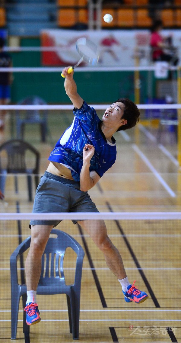 ‘이용대 올림픽제패기념 2017 화순 전국학교대항 배드민턴선수권대회’가 22일부터 28일까지 전남 화순군 하니움문화스포츠센터와 이용대체육관에서 열린다. 23일 남자대학부 단식 경기에서 백석대 고경보가 스매싱 공격을 하고 있다.
