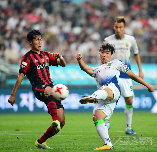 23일 서울월드컵경기장에서 2017 KEB하나은행 K리그 클래식 23라운드 FC서울과 전북현대의 경기가 열렸다. 전반 전북현대 이동국이 FC서울 김원균의 마크를 앞에 두고 발리슛을 하고 있다.
