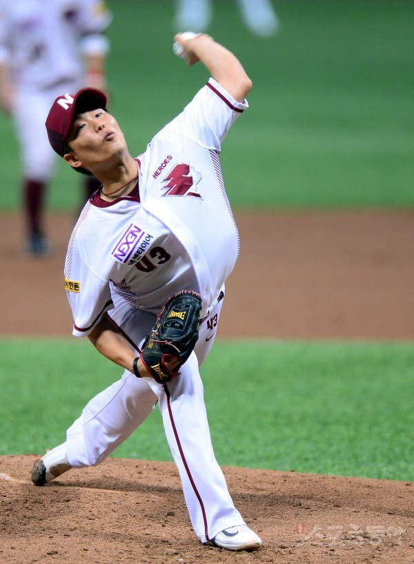 23일 서울 고척 스카이돔에서 ‘2017 타이어뱅크 KBO리그’ 넥센 히어로즈와 kt 위즈의 경기가 열렸다. 넥센 선발투수 김성민이 힘차게 볼을 던지고 있다.