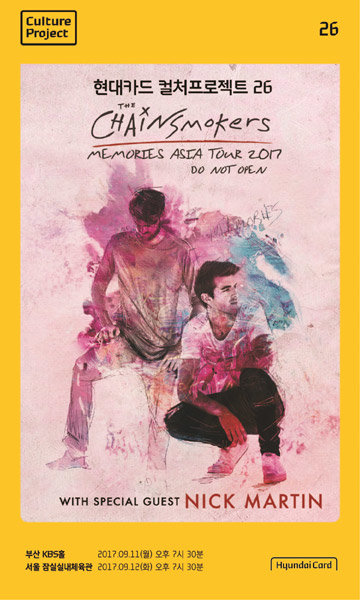 현대카드 측은 “체인스모커스는 EDM과 팝의 경계를 넘어 세계 대중음악의 새로운 트렌드를 이끌고 있는 대세 뮤지션”이라며 “이번 컬처프로젝트가 세계를 열광시키는 이들의 매력을 느낄 수 있는 기회가 될 것”이라고 했다.