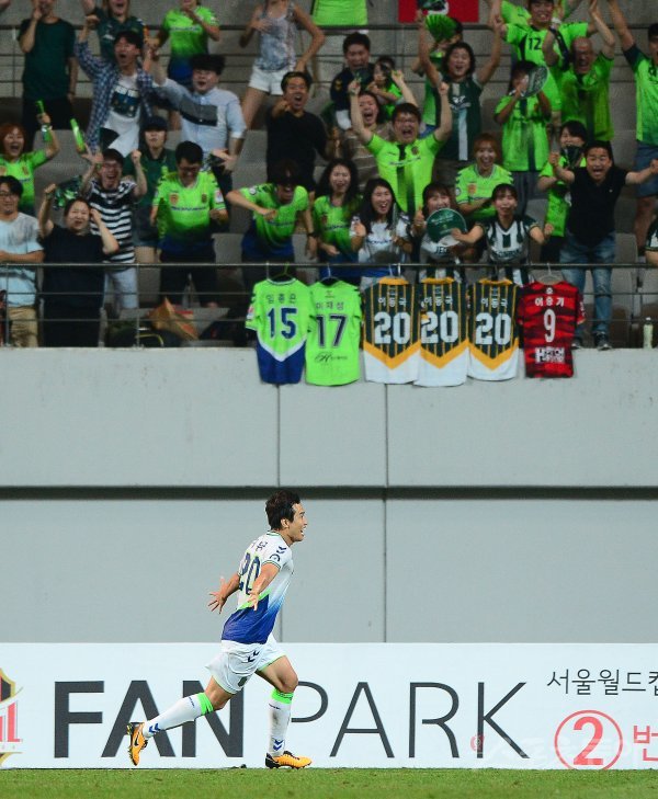 23일 서울월드컵경기장에서 2017 KEB하나은행 K리그 클래식 23라운드 FC서울과 전북현대의 경기가 열렸다. 후반 전북현대 이동국(가운데)이 팀의 두 번째 골을 넣은 후 환호하고 있다.