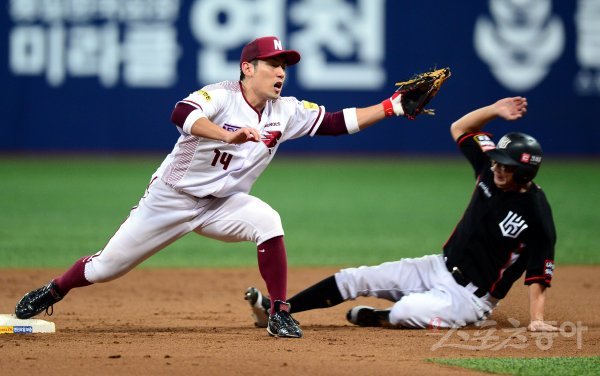 23일 서울 고척 스카이돔에서 ‘2017 타이어뱅크 KBO리그’ 넥센 히어로즈와 kt 위즈의 경기가 열렸다. 7회초 1사 1루에서 kt 이대형의 내야 땅볼 때 1루 주자 김연훈이 2루에서 넥센 서건창에게 포스 아웃되고 있다.