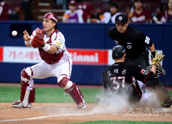23일 서울 고척 스카이돔에서 ‘2017 타이어뱅크 KBO리그’ 넥센 히어로즈와 kt 위즈의 경기가 열렸다. 7회초 1사 3루에서 kt 김연훈의 스퀴즈 번트 때 3루 주자 오태곤이 득점에 성공하고 있다.