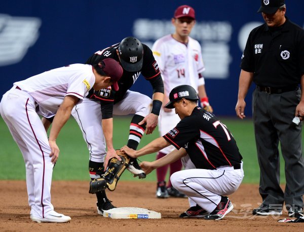 23일 서울 고척 스카이돔에서 ‘2017 타이어뱅크 KBO리그’ 넥센 히어로즈와 kt 위즈의 경기가 열렸다. 7회초 1사 2루에서 kt 오태곤이 1타점 2루타를 치고 난 뒤 보호장비를 힘겹게 벗고 있다.