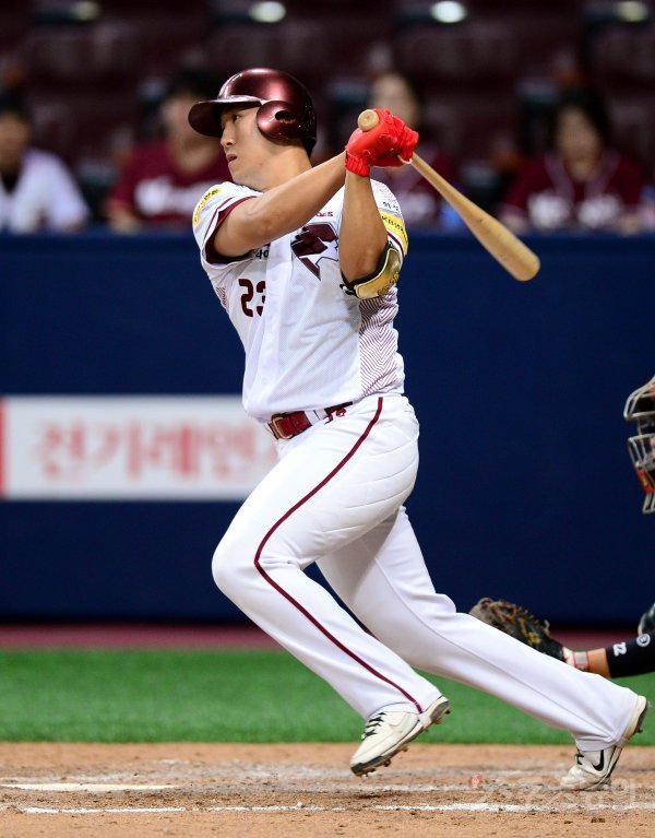 23일 서울 고척 스카이돔에서 ‘2017 타이어뱅크 KBO리그’ 넥센 히어로즈와 kt 위즈의 경기가 열렸다. 8회말 1사 만루에서 넥센 장영석이 1타점 적시타를 날리고 있다.