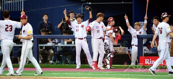 23일 서울 고척 스카이돔에서 ‘2017 타이어뱅크 KBO리그’ 넥센 히어로즈와 kt 위즈의 경기가 열렸다. 8회말 넥센 선수들이 역전에 성공한 뒤 이닝 종료 후 더그아웃의 선수들이 환호하고 있다.