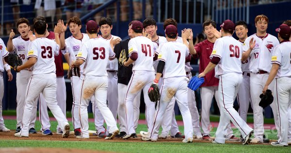 23일 서울 고척 스카이돔에서 ‘2017 타이어뱅크 KBO리그’ 넥센 히어로즈와 kt 위즈의 경기가 열렸다. 넥센이 kt에 7-4로 승리한 뒤 선수들이 그라운드에서 기쁨을 나누고 있다.