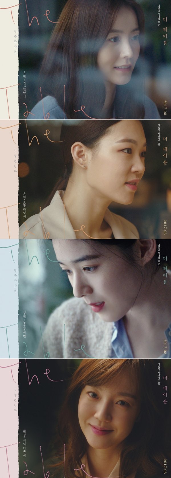 감성적인 비주얼로 시선을 사로잡는 ‘더 테이블’의 캐릭터 포스터에는 클로즈업 된 네 배우의 모습과 함께 각각의 캐릭터가 카페 테이블에 머무르는 간 시간과 “마음이 지나가는 곳”이라는 카피가 담겨 호기심을 자극한다. 오전 열한 시 스타 배우가 되어 전 남자친구를 만나게 된 ‘유진’, 오후 두 시 반 하룻밤 사랑을 나눈 후 떠난 남자와 재회한 ‘경진’, 오후 다섯 시 결혼 사기로 엮인 가짜 엄마와 만난 ‘은희’, 저녁 아홉 시 결혼을 앞두고 전 애인을 만난 ‘혜경’ 등 각자의 인연을 만나기 위해 서로 다른 시간, 같은 공간에 머물다 간 네 캐릭터의 모습이 공개되어, ‘더 테이블’이 담고 있는 하나의 테이블을 거쳐간 다양한 인물들의 인연과 삶에 관한 이야기에 대한 궁금증 역시 고조되고 있다. 또한 정유미, 한예리, 정은채, 그리고 임수정 네 명의 배우는 물론 김혜옥, 연우진, 정준원, 전성우 등 베테랑 배우부터 기대주 신인까지 매력 넘치는 배우들이 가세해 색깔 있는 연기를 선보일 예정이다.